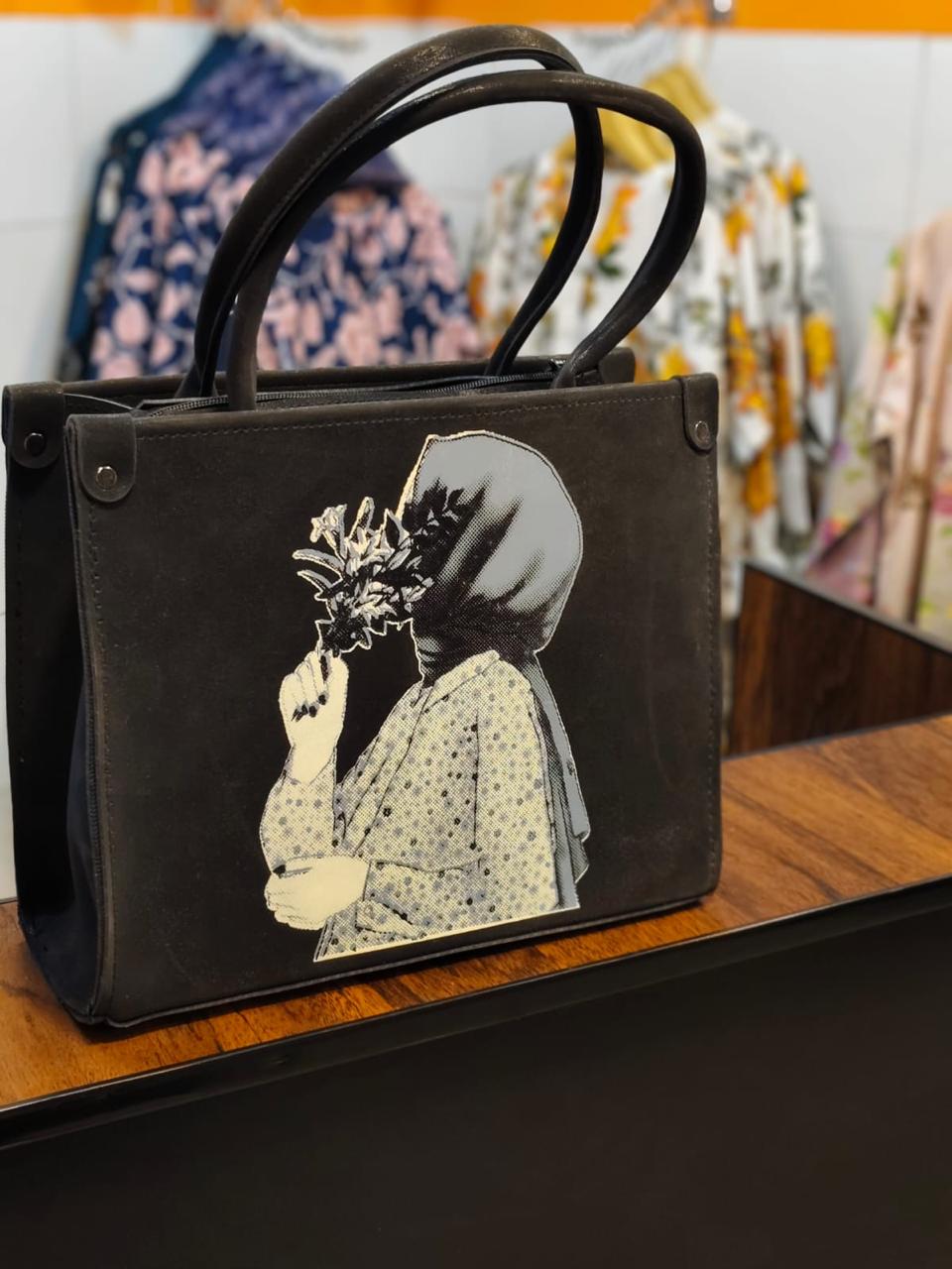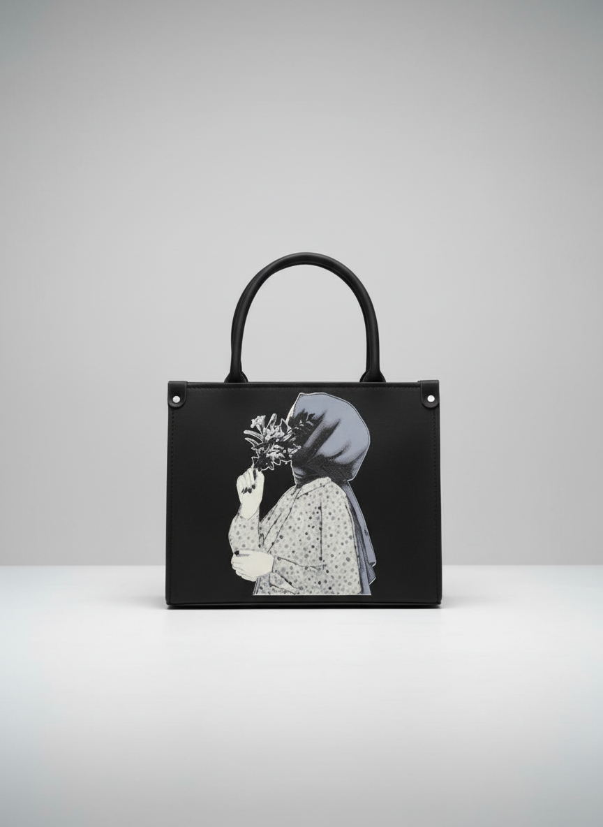 Set against a sleek, matte onyx black background, the bag features a striking graphic of a woman in a hijab holding a bouquet of flowers to her face. The artwork is rendered in a soft, monochromatic palette of greys and whites, creating a "sketched" effect that feels intimate and poetic.