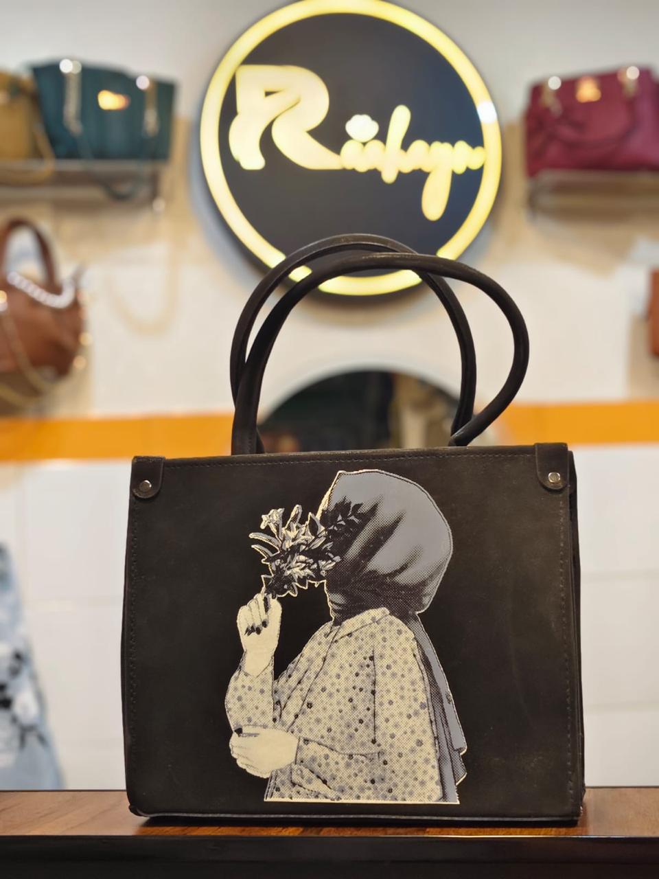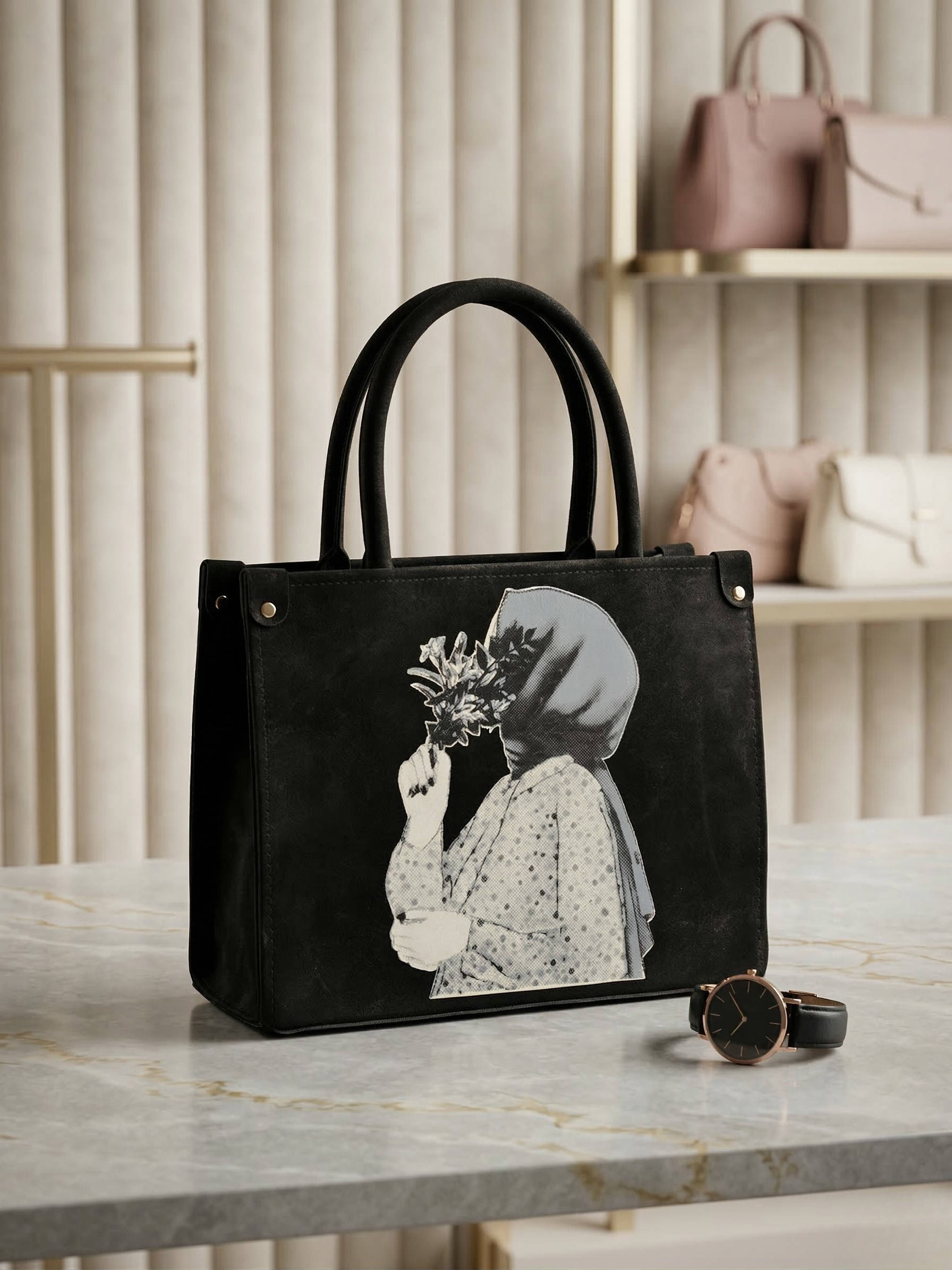 This handbag is a poignant piece of narrative fashion, combining a minimalist aesthetic with a deeply expressive, artistic illustration. It is a tribute to grace, modesty, and the quiet beauty of nature.