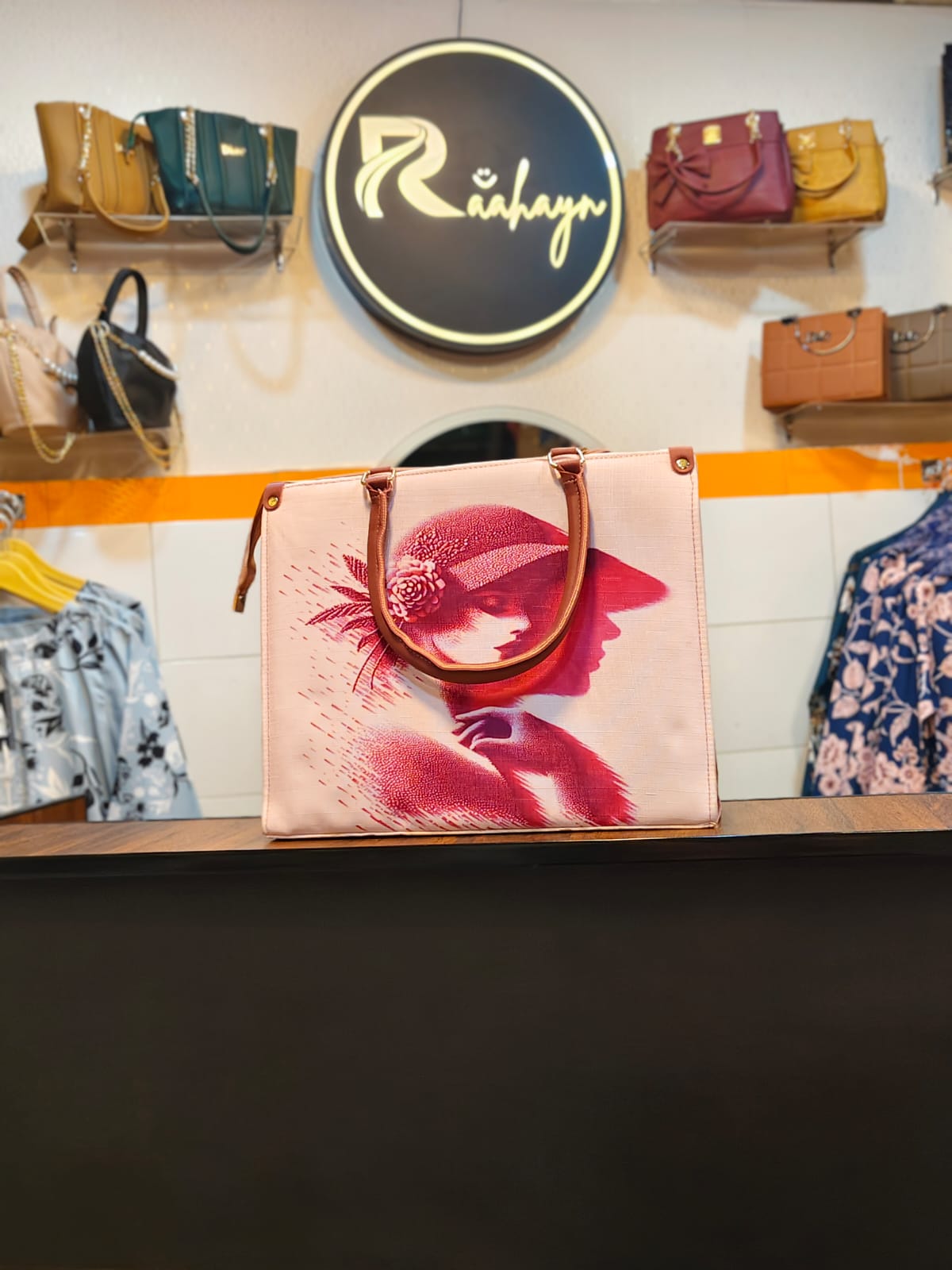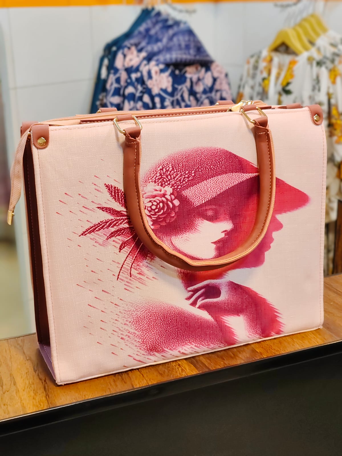Bring a touch of soft, artistic romance to the Raahayn collection with this captivating graphic tote. Designed as a lighter, breezier counterpart to the Crimson Muse, this bag perfectly balances a beautifully structured everyday silhouette with a vibrant, vintage-inspired focal point.