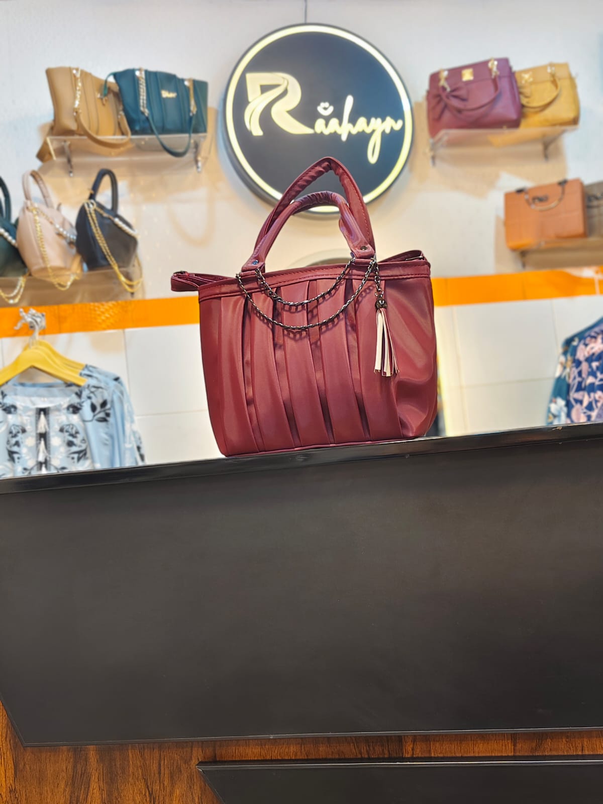 Draped Chain Detail: A double-layered gunmetal chain drapes elegantly across the front, finished with a matching leather tassel for a hint of edgy, "rock-chic" movement.