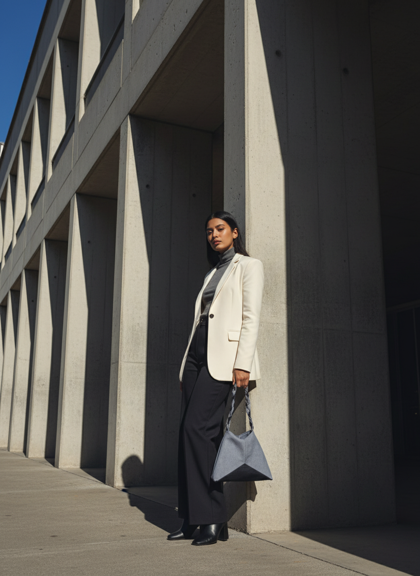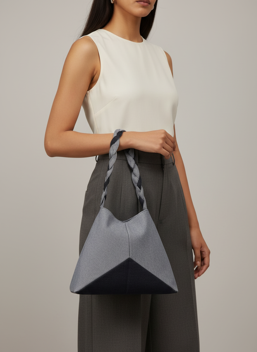 The Vertex features a unique, multi-paneled construction that creates a striking triangular silhouette. By blending tonal shades of premium denim, the bag achieves a 3D depth that shifts with the light.