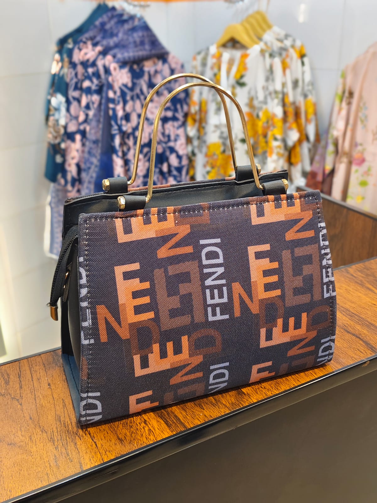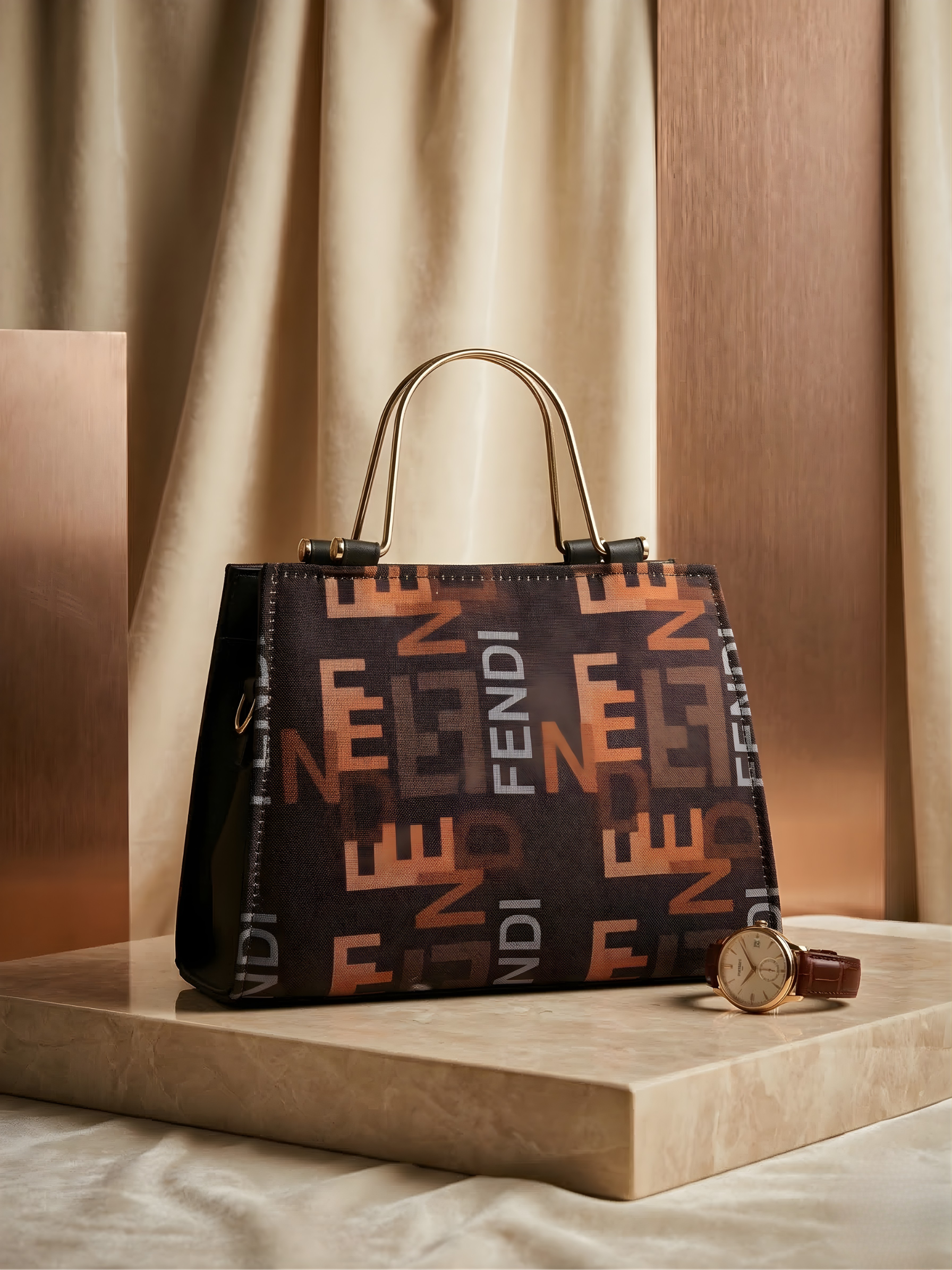 Sleek Metal Handles: Elevated by slender, rigid gold-tone metal top handles that provide a sharp, architectural contrast to the bag's boldly patterned exterior.