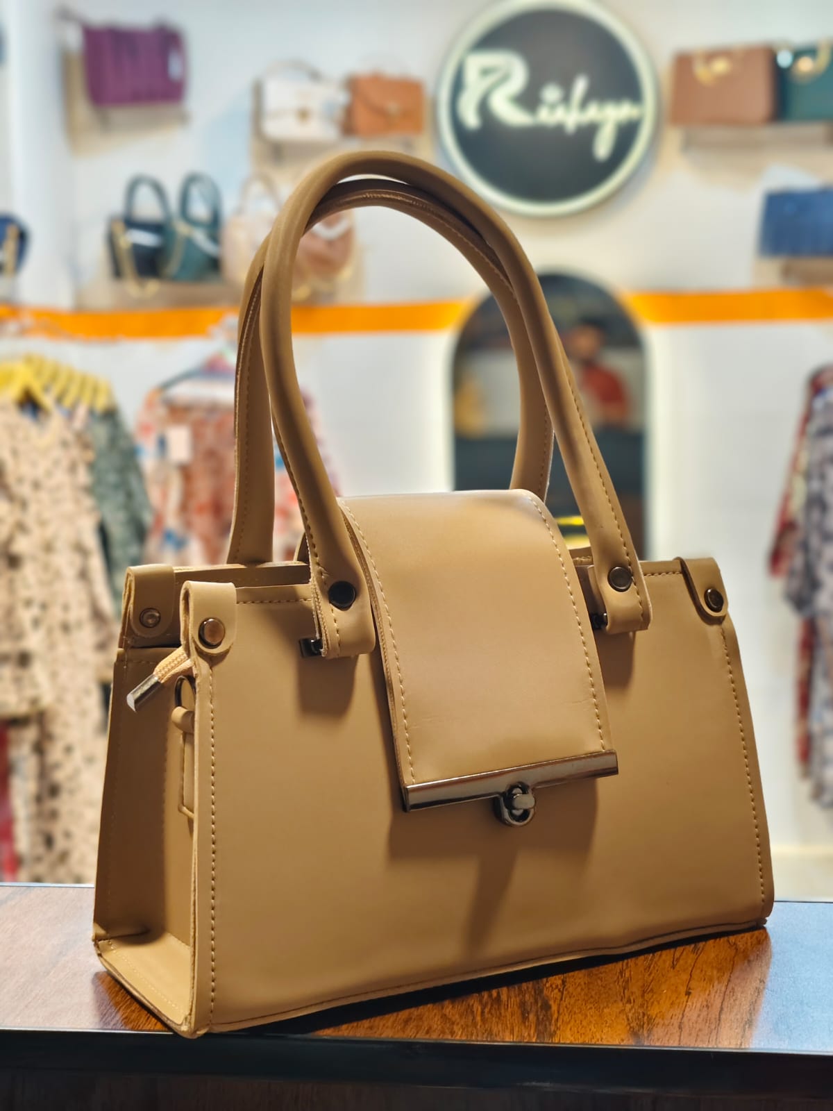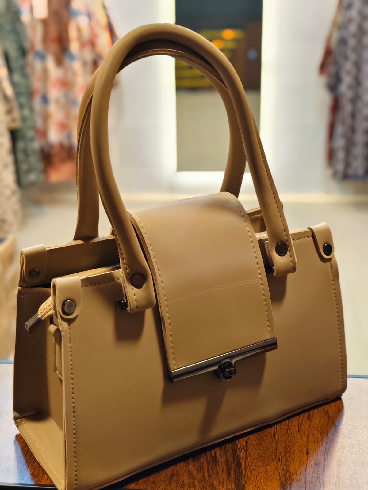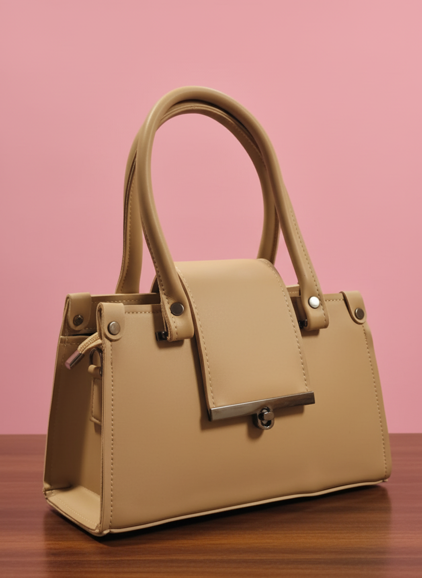 The Serene Flap Satchel Sophistication meets structural precision in the Serene Flap Satchel. Dressed in a timeless nude palette, this bag features a bold, oversized front flap secured by a signature gunmetal turn-lock. Its sharp trapezoidal silhouette and clean lines make it a masterclass in "Quiet Luxury." Designed for the modern woman who values understated elegance, it provides a polished finish to any look, from professional tailoring to weekend denim.