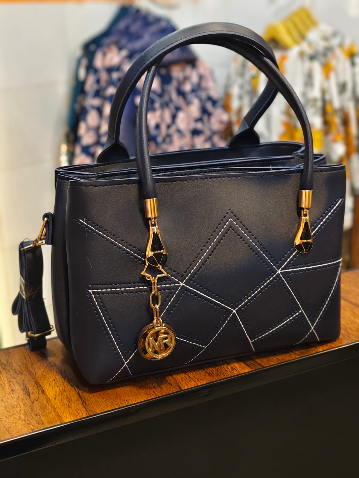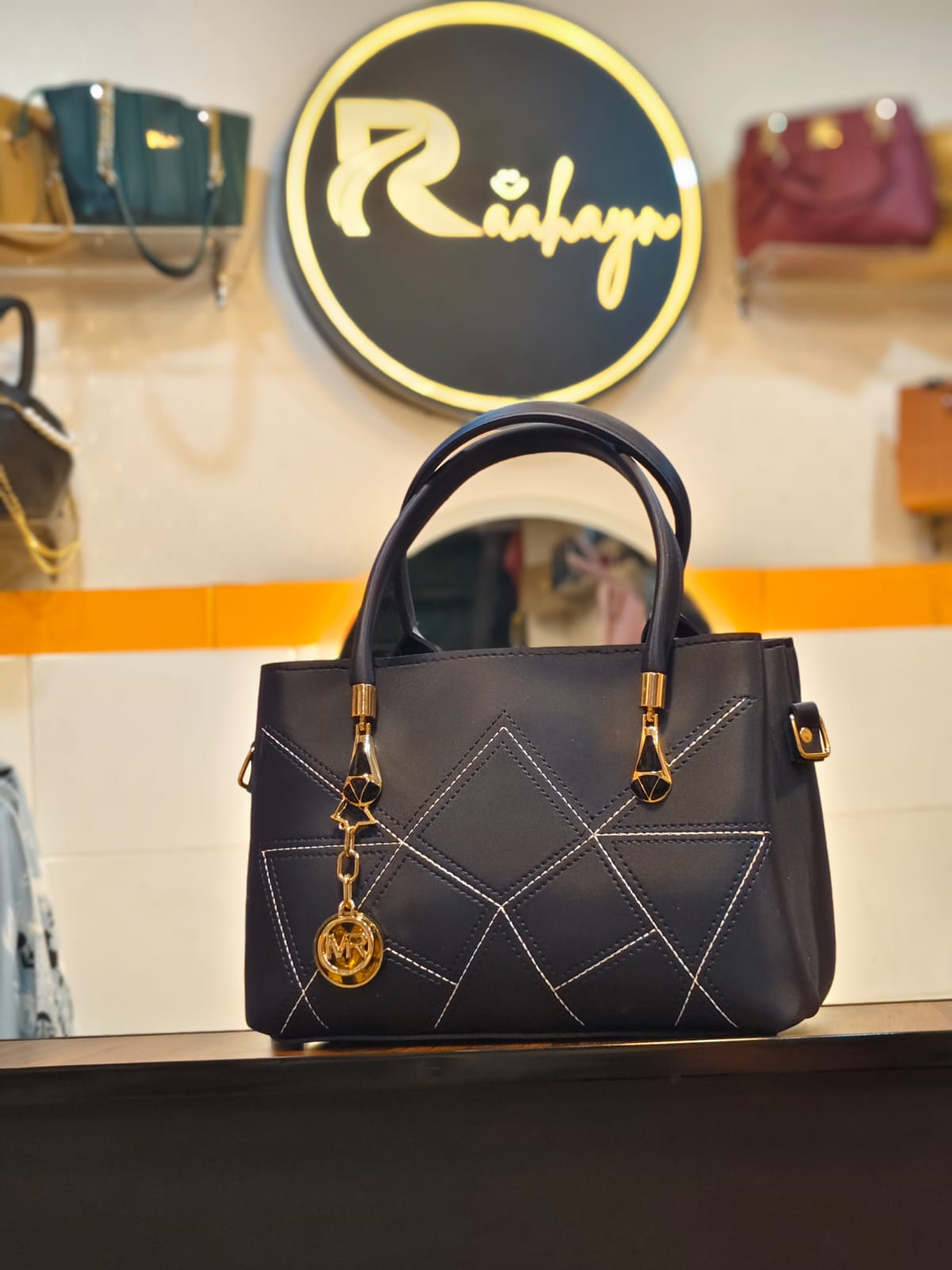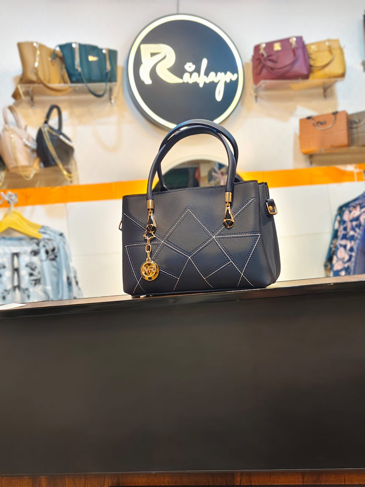 Signature Medallion: A prominent gold-tone circular charm engraved with "MR" hangs from a delicate link chain, serving as a luxurious focal point against the dark blue base.