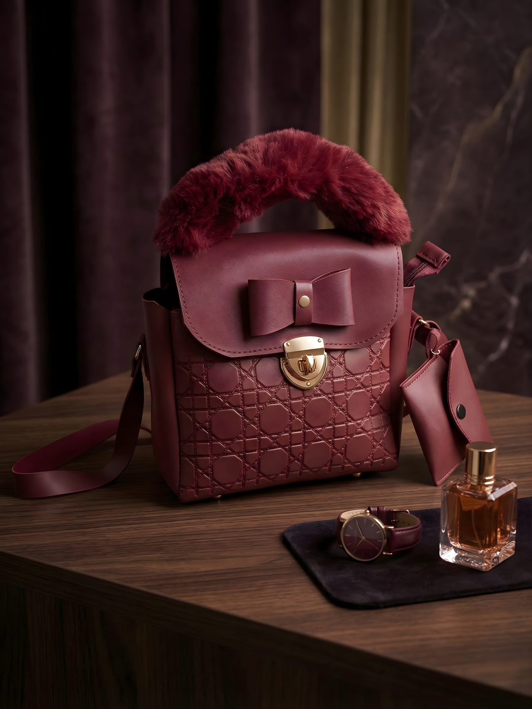 This bag perfectly balances structural rigidity with soft, eye-catching accents. The deep plum-burgundy palette makes it an ideal companion for cool-weather styling, pairing beautifully with tailored coats, evening dresses, or sleek monochrome outfits.