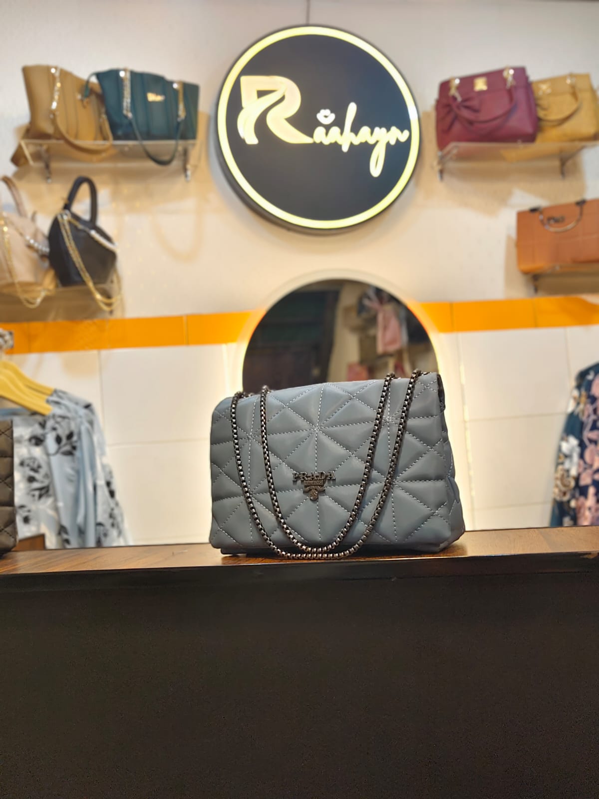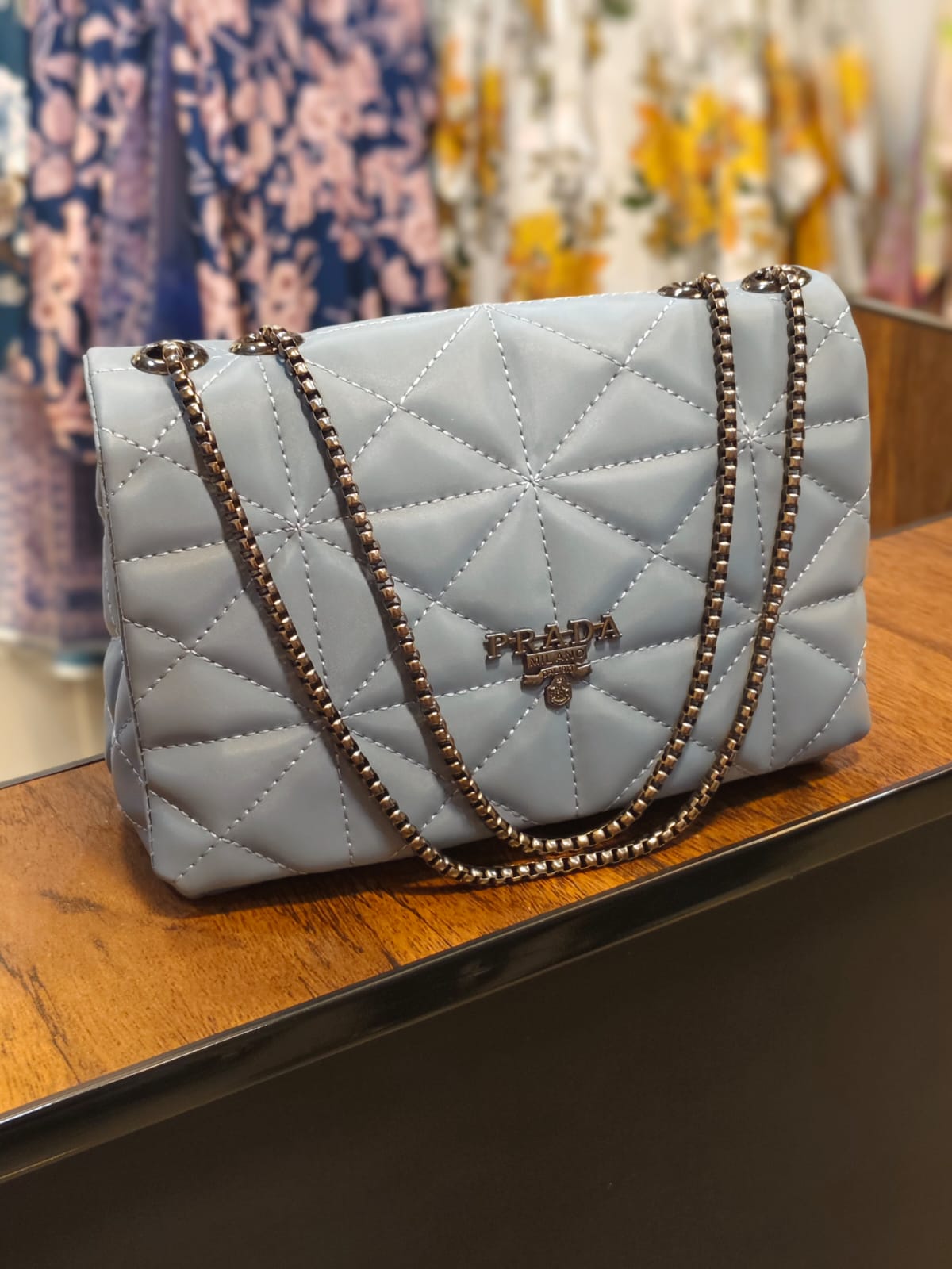 Exude contemporary chic with The Polygon Flap, a masterpiece of geometric design and understated luxury. Draped in a cool, sophisticated slate grey, this bag redefines the classic quilted shoulder bag with its unique, architectural stitching and sleek metallic accents.