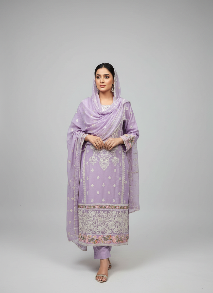Embrace the soft radiance of The Wisteria Whisper, a design that captures the essence of a serene summer evening. This 3-piece ensemble is a masterclass in delicate craftsmanship, blending a dreamy lilac palette with luminous mirror-work and artisanal accents for a truly regal finish.