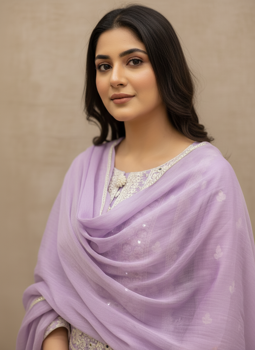 The Dupatta: A statement in itself, the matching lavender dupatta is crafted from a lightweight, breezy fabric. It features vertical tonal stripes and scattered sequin motifs that catch the light beautifully, finished with a fine silver-embroidered border.