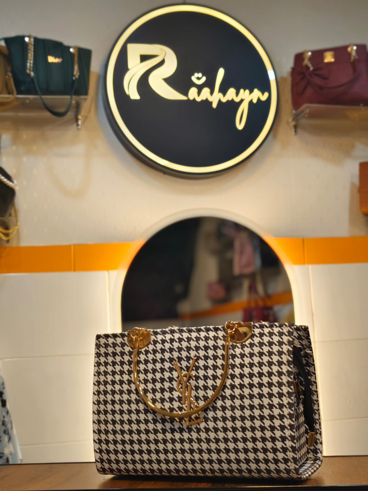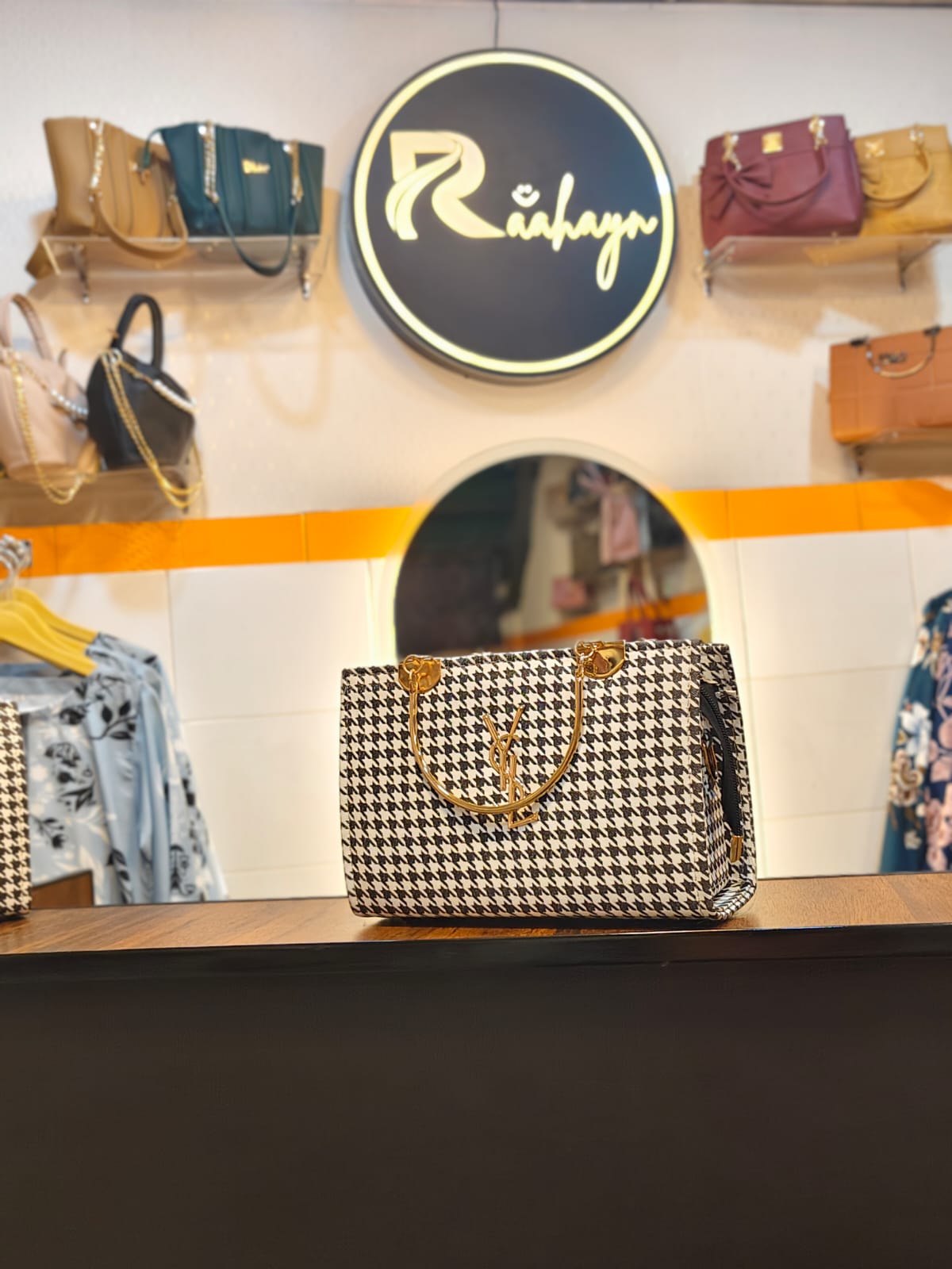 Bring a touch of timeless sophistication to the Raahayn collection with this stunning houndstooth tote. Blending a classic, vintage-inspired pattern with modern, striking hardware, this structured bag is the ultimate accessory for elevating any chic ensemble.