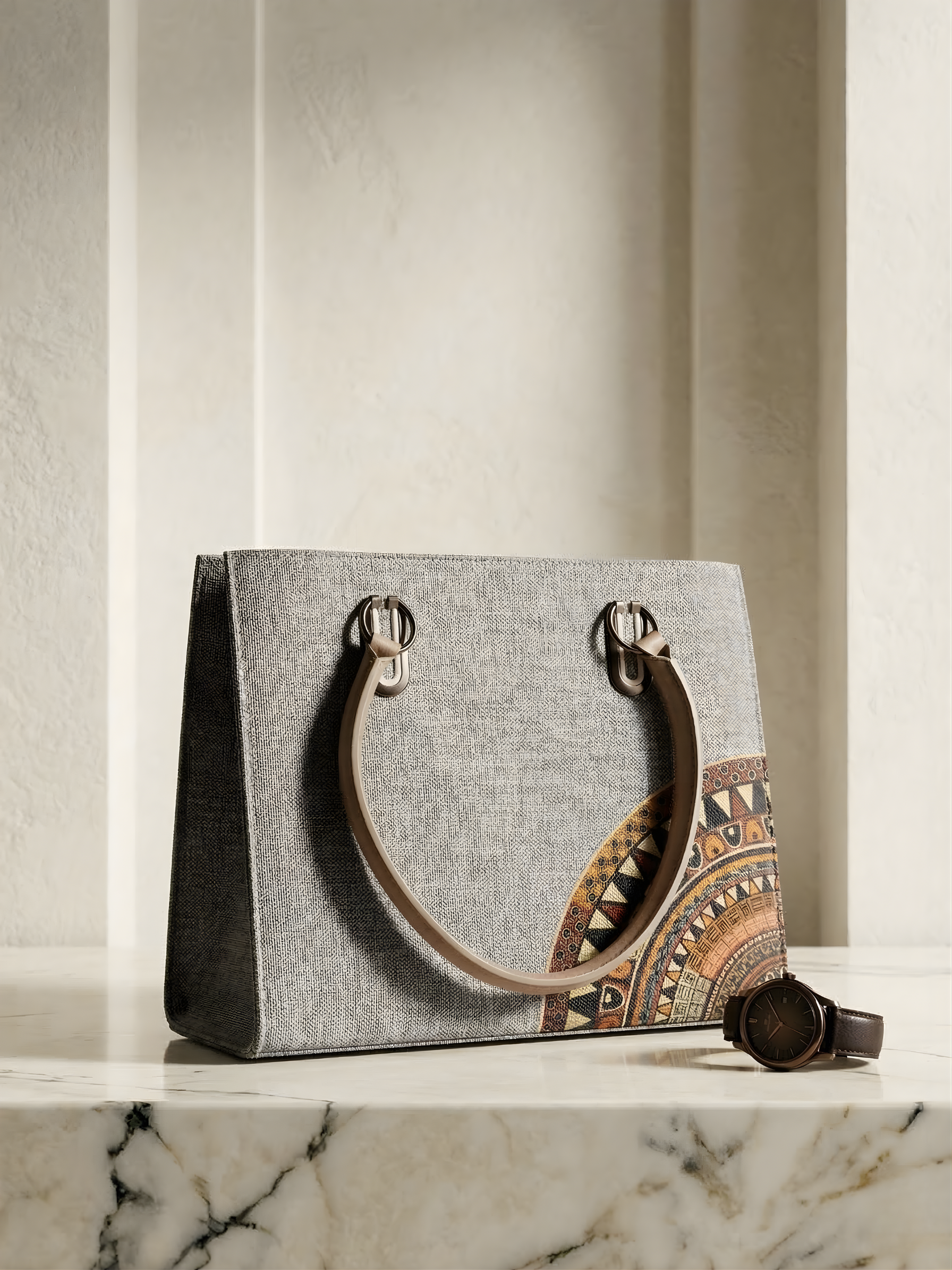 Bring a touch of bohemian elegance to the Raahayn collection with this uniquely structured tote. Blending a minimalist, textured backdrop with rich, earthy artistry, this bag is a standout accessory for the modern, eclectic wardrobe.
